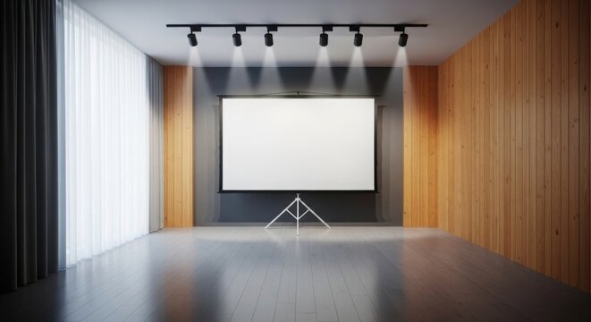 Minimalist interior features wallmounted television. Light streams through sheer curtains, creating soft shadows. Wooden floor completes space.