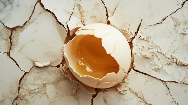 Close-up of a cracked egg on a marble surface, showcasing the yolk and shell fragments in detail.