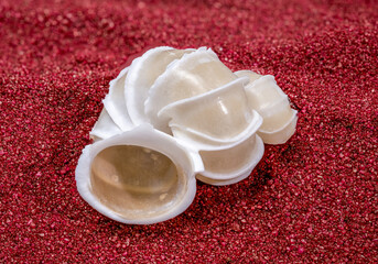 Close-up of seashells and shell fragments scattered on sandy beach. Natural marine background with variety of colors and textures. Perfect for summer, seaside, and nature concepts.