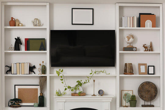 Front view, unmanned retail store, shelves filled with a variety of food,, snacks, drinks, bags categorized and placed, modern minimalist decoration style. Generative AI.