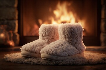 Cozy Fluffy White Boots Warming by a Blazing Fireplace
