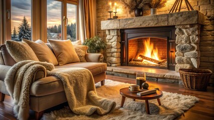 A cozy living room with a sherpa blanket and a fire burning in the background, perfect for winter warmth