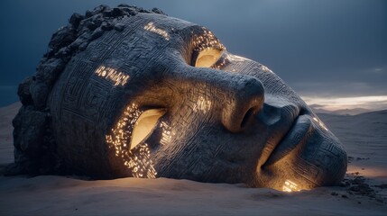 A giant stone face lies in a desert landscape, illuminated by glowing inscriptions, evoking a mystical atmosphere.