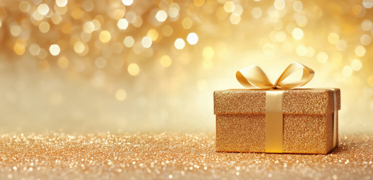 Shimmering golden bokeh background featuring glowing orbs, sparkles and warm light