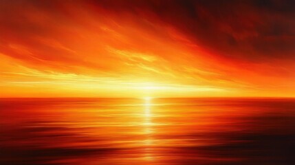 Fiery orange sunset over a calm sea with glowing horizon and cloud-streaked sky reflecting warm light across tranquil water, evoking awe and peaceful warmth