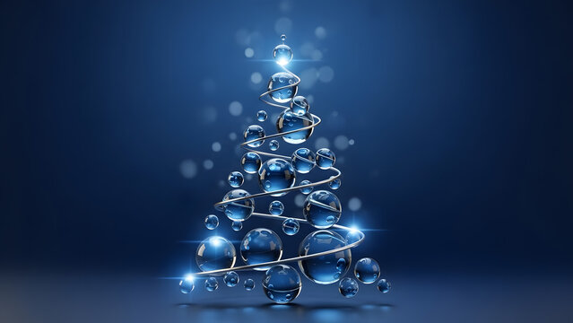 A shimmering christmas tree composed entirely of cool blue water droplets