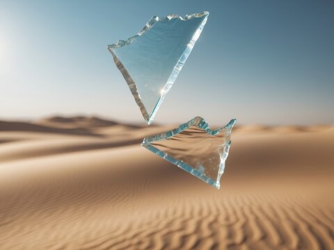 Iridescent shards float against a vibrant blue sky, shimmering with pink hues