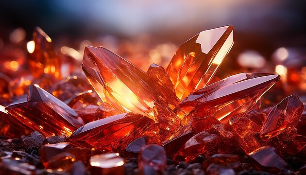 a vibrant composition of scattered shimmering crystal like shards illuminated by fiery hues of orange and red against a soft backdrop