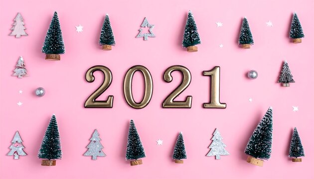 A festive, minimalist design featuring the year 2021, surrounded by miniature Christmas trees and shimmering accents against a soft pink background.