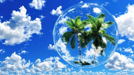 Palm trees captured in a shimmering bubble floating amid a dreamy skyscape full of fluffy clouds