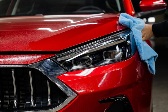 Sleek blue sports car with vibrant headlights shining on a rainy day.