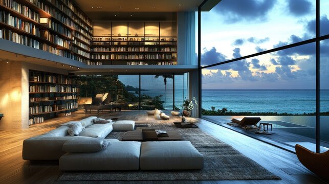 Modern office space at night. Blurred view of city lights outside large windows. Interior with plants, furniture. Abstract design. Nighttime urban vibe. Blending of indoor, outdoor elements. Working