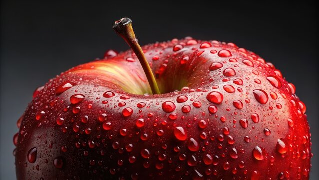 Close-up of a shiny red apple with water droplets on it, sweet treat, juicy apples