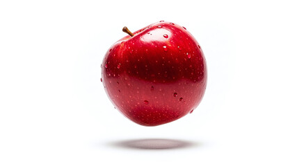 A shiny red apple with water droplets and a small stem floating above a white surface with a faint shadow