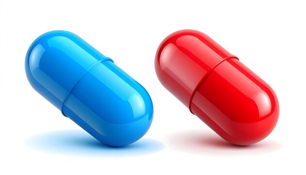 Two glossy capsules, one blue, one red, on a white background
