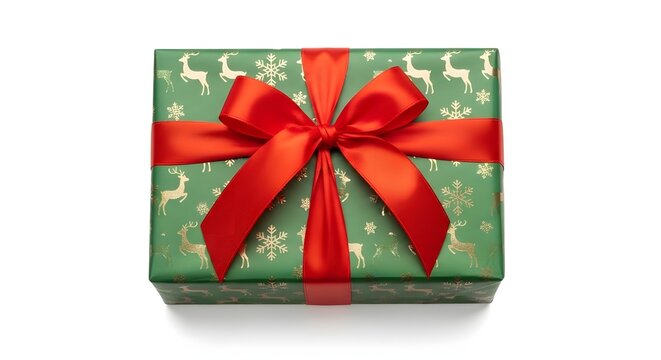 Festive green Christmas present with a shiny red satin ribbon and bow, ready for the holiday season celebration