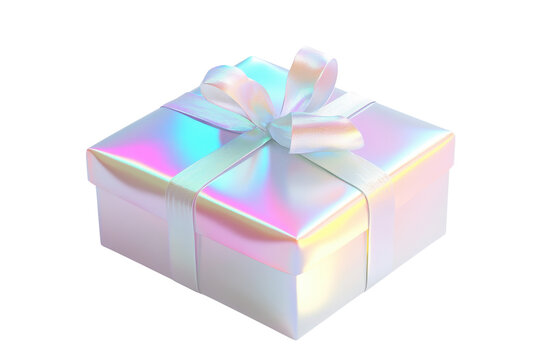 Holographic gift box with pink ribbon isolated on transparent background. White gift box with ribbon holographic Iridescent icon isolated on white background, 3d rendering.