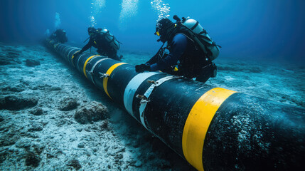 Spinning underwater ship propeller creates air bubbles in deep blue ocean, illustrating engineering power and energy flow