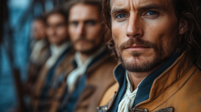 A group of rugged pirates stands confidently on their ship illuminated by warm light ready to set sail for new adventures across the vast ocean