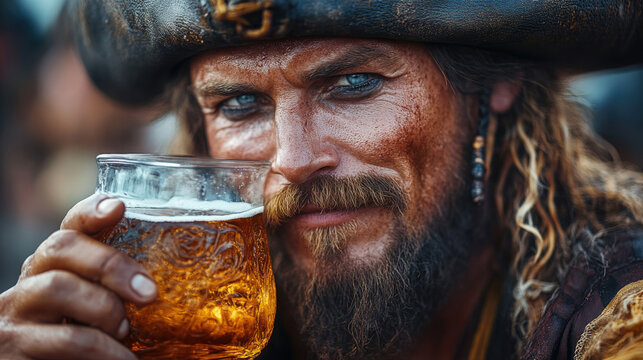 A pirate holds a frosty mug, showcasing a spirited celebration among crew under the evening sun