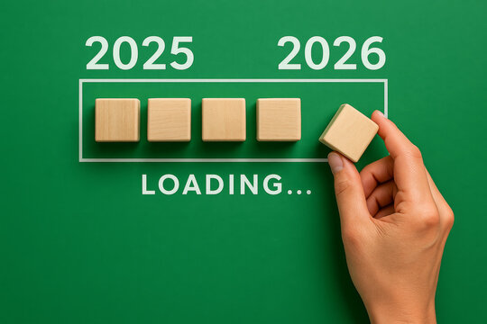 Transitioning from 2025 to 2026 with a loading bar and touch, symbolizing progress and the anticipation of a new year.