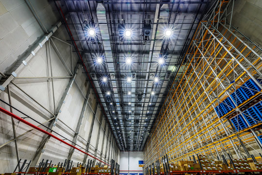 Boxes on conveyor belt in modern automatized high rack warehouse