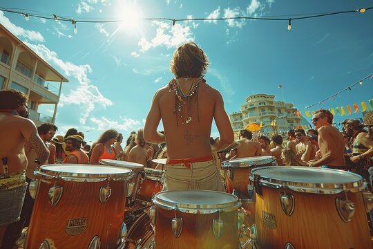 Shirtless drummers on a sandy beach beat the rhythm creating a lively and energetic atmosphere under the bright sun, conveying freedom and excitement.