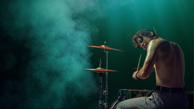 Shirtless drummer on stage in green smoke and spotlight performing intensely. Concept of physical energy, creative discipline, freedom, and emotional storytelling through rhythm and music.