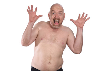 shirtless man pointing with scared on white background