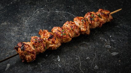 Grilled poultry shish kebab seasoned with salt, spices, and fresh herbs on a dark surface