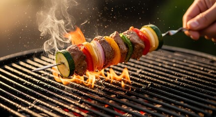 Summer barbecue concept with a hand grilling a fresh and colorful shish kebab skewer over a hot, smoky charcoal grill
