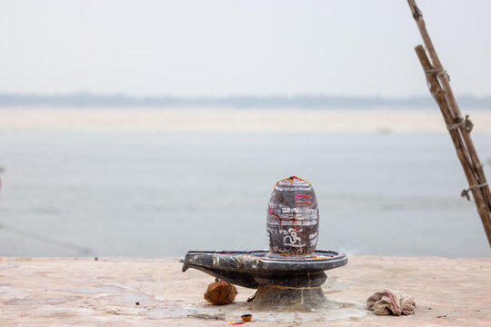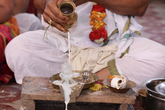 Performing Pooja for Hindu god siva linga with milk, honey and coconut water