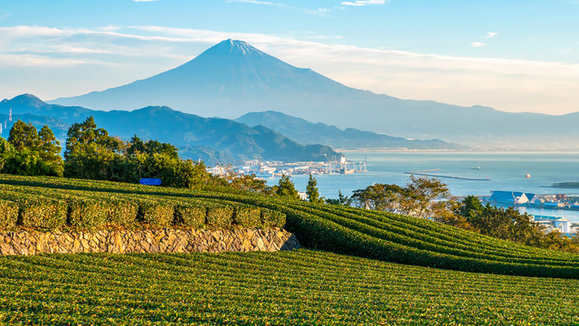 Mt. Fuji with green tea field at sunrise in Shizuoka, Japan.