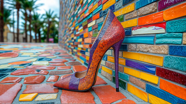 Colorful high-heeled shoe with a snake texture pattern against a vibrant mosaic tile background.  .
