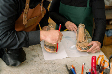 Shoemaker drawing a pattern on the shoe model
