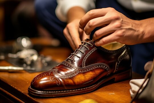 Shoe luxury polishing closeup master. Hands of individual workshop master. Generate Ai