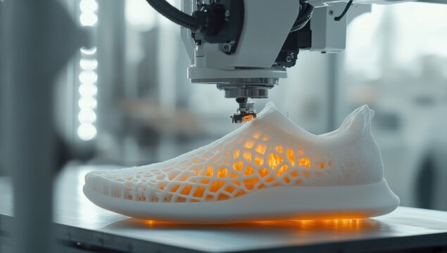 3D printed shoe being manufactured by a robotic arm.  A close-up view of a white 3D printed shoe in the process of being created by a robotic arm. The shoe's intricate lattice design is clear.
