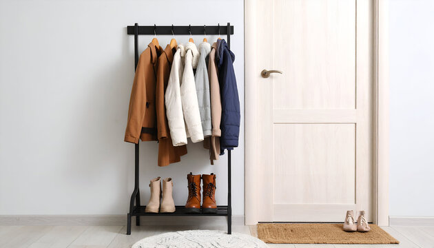 A black metal coat rack stands near a white door, holding coats and boots, with a doormat and shoes on the floor.
