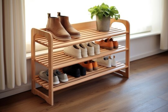 Assorted shoes on a wooden shoe rack in a home setting. Organization and interior design concept.