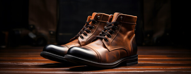 Pair of leather dress shoes on wooden floor in spotlit dark room