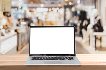 Empty screen laptop on a wooden table with abstract blurred background of interior clothing store at Shopping Mall