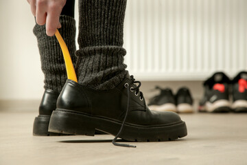 Long black shoehorn or shoe spoon plastic isolated on white background