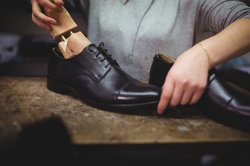 Senior shoemaker carefully inspecting leather shoe in workshop
