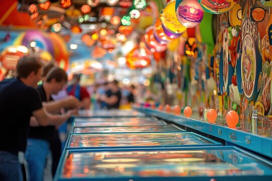 Couple playing and shooting with pistols in an amusement arcade