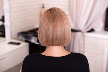 Back view of young brunette with short curly hair on gray background. Her hairstyle is a bob.