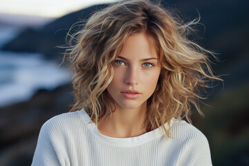 Smiling mature woman with a chic short blonde layered hairstyle, white top, at a beachside venue. Elegant confidence for lifestyle, anti-aging beauty, or mature hair care promotions