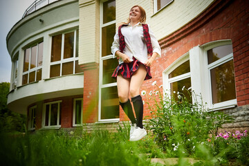 Young girl with short hair in a school checkered uniform outdoors.