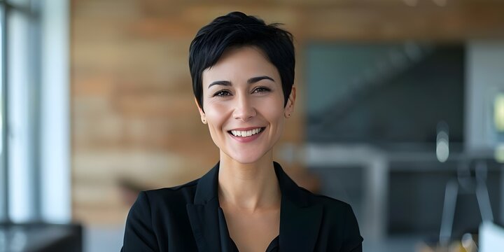 Woman with short black hair smiling in office portrait wearing black jacket. Concept Portrait Photography, Professional Attire, Black Hair, Office Setting, Smiling Pose