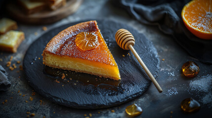 Slice of Orange Honey Drizzle Tart with Candied Orange and Shortbread, Premium Citrus Dessert