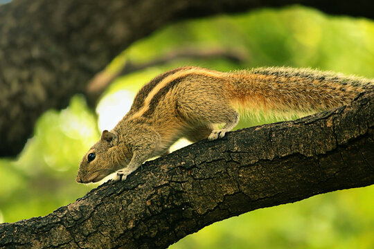 The Indian palm squirrel or three-striped palm squirrel (Funambulus palmarum).  The palm squirrel is about the size of a large chipmunk, with a bushy tail slightly shorter than its body.